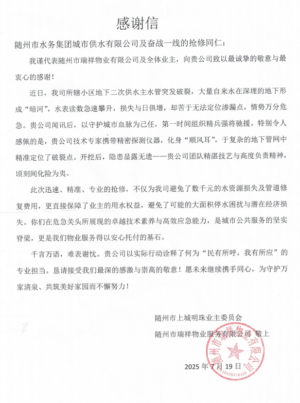 7月19日,上城明珠小區(qū)業(yè)委會(huì)與瑞祥物業(yè)的代表滿(mǎn)懷感激,將一面繡有“排憂(yōu)解難、水域神探” 的錦旗和一封情真意切的感謝信送到城市供水公司,以此表達(dá)全體業(yè)主對(duì)城市供水公司的誠(chéng)摯謝意。“若不是有你們團(tuán)隊(duì)的精湛技藝與高度負(fù)責(zé)精神,我們的損失不堪設(shè)想!這面錦旗雖輕,卻裝著全體業(yè)主的滿(mǎn)心感激!” 代表們緊握工作人員的手,話(huà)語(yǔ)間滿(mǎn)是動(dòng)容。